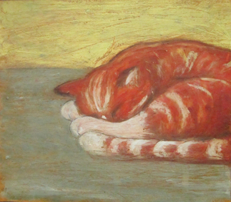 red cat and yellow wall